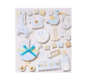 Wunderschöne 3D-Sticker „“Baby Boy II““ in Blau. Die Sticker sind harmonisch aufeinander abgestimmt und ergeben eine niedliche Grundlage für Ihre Kartengestaltung zur Geburt eines Jungen. Die hochwertig bedruckten Klebemotive sind ca. 1,5 bis 7,2 cm groß und ideal für das persönliche Gestalten von Fotoalben, Geschenkverpackungen, Grußkarten und mehr. Einige der 3D-Sticker sind mit Glitzersteinen versehen und die Schleife des Kinderwagens wirkt täuschend echt. Neben den 3D-Motiven sind auch einfache Aufkleber auf diesem Stickerbogen zu finden. Selbstklebend Material: Papier