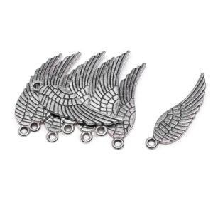 Wunderschöne Schmuckanhänger „“Engelsflügel““ im 9er-Pack. Diese silberfarbenen Engelsflügel können Sie großartig für sämtliche Ketten, Armbänder oder Ohrringe benutzen. Die Engelsflügel sind ca. 0,9 cm breit und ca. 3,1 cm lang. Durch eine Öse können Sie den Anhänger auf ein dünnes Band auffädeln oder mithilfe eines Ringels an einer dickeren Kette befestigen. Ösendurchmesser (innen): 1.1 mm Inhalt: 9 Stück Breite: 0.9 cm Höhe: 3.1 cm Material: Metall