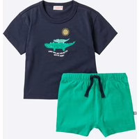 Dieses Baby-Jungen-Set von Liegelind kombiniert ein charmantes T-Shirt mit Krokodil-Design und eine bequeme grüne Short. Das Shirt hat einen hohen Baumwollanteil, was für ein angenehmes Tragegefühl sorgt. Die funktionellen Tapes am Bund der Shorts bieten zusätzlichen Komfort im Alltag. Modisches 2-teiliges Baby-Jungen-Set T-Shirt mit Krokodil-Design Shorts mit funktionellen Tapes Mit Baumwolle OEKO-TEX® Standard 100 zertifiziert