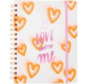 Tolles Bullet Diary „“In Love With Me““ mit 164 Seiten und Verschlussband für Jahresplanung, To-Do-Listen, Gedanken, kreative Ideen und vieles mehr im praktischen DIN A5 Format. Das Papiergewicht beträgt ca. 120 g/m². Nutzen Sie das Bullet Diary für eigene Ideen, wichtige Notizen und Termine. So entsteht ein ganz eigenes und persönliches Notizbuch und prima Begleiter für den Alltag und unterwegs. Das Bullet Diary mit schickem Cover, welches mit Herzen und einem glitzer Schriftzug „“In Love With Me““ verziert ist, beinhaltet Blanko-Seiten mit Punkteraster und Sticker in Neon-Orange und Neon-Grün. Grammatur: 120 g/qm DIN Format A5