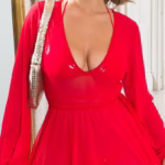 Glitzer Mesh Minikleid Cover-up Kleid Strandkleid Transparent mit Trompeten Langarm XXL-V-Ausschnitt und Gürtel – Sexy Cover-up-Kleid