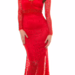 Spitzen V-Neck Langarm Maxi Silvester Cocktail Kleid mit Deko Perlen – Sexy Abendkleid