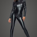 Verführerischer schwarzer Wetlook-Overall mit Reißverschluss und Stehkragen figurbetonter Einteiler für Club, Party & aufregende Nächte – Verführerischer schwarzer Wetlook-Overall