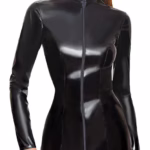 Ärmelloser Overall von Black Level komplett im schwarzen Lackglanz. In figurnaher taillierter Schnittführung mit runden Ausschnitt vorne und tiefem V-Ausschnitt hinten.