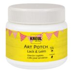 Mit dem KREUL Art Potch Lack & Leim „“Glimmer““ verleihst du deinen Bastelprojekten einen funkelnden Effekt. Der Spezialkleber auf Wasserbasis ist Lack und Leim in einem, was ihn besonders praktisch und nachhaltig macht. Mit nur einem Produkt kannst du somit Serviettenmotive auf Gegenstände aufkleben und anschließend lackieren. Das Gebinde des KREUL Art Potch Lack & Leim besteht aus recyceltem Plastik, wodurch du zusätzlich einen Beitrag zum Umweltschutz leistest. Der glitzernde Kleber und Lack eignet sich perfekt für die Gestaltung von Holz, Karton, Leinwand, Kork, Keramik, Terrakotta, Stein, Beton, Glas, Metall und Kunststoff. Du kannst damit also eine Vielzahl von Materialien verschönern und ihnen einen individuellen Touch verleihen. Die Anwendung des KREUL Art Potch Lack & Leim „“Glimmer““ ist ganz einfach: Trage ihn dünn mit einem Pinsel auf den gewünschten Gegenstand auf und lege anschließend die bedruckte oberste Serviettenlage darauf. Mit dem Potch kannst du dann noch einmal darüberstreichen, um das Motiv zu fixieren und zu lackieren. Schon hast du ein glitzerndes Kunstwerk geschaffen. Der Lack trocknet transparent auf und ist wasserfest sowie wetterfest. Du kannst also auch für den Außenbereich basteln, ohne dass deine Werke Schaden nehmen. Mit dem KREUL Art Potch Lack & Leim „“Glimmer““ verleihst du deinen Bastelprojekten einen funkelnden Touch und setze glitzernde Akzente. Ob auf Holz, Glas oder Metall – mit diesem Produkt kannst du alles verschönern. Probiere es aus und lass dich von dem glitzernden Effekt begeistern! Füllmenge: 150 ml Lösungsmittelfrei