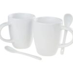 Ein großartiges Set zum Verschenken und individuellem Gestalten. Zwei Becher aus Porzellan mit Löffelhalterung im Henkel. Die Füllmenge eines Bechers beträgt ca. 300 ml. Das Tassen-Ø oben beträgt ca. 8,5 cm und unten ca. 5,5 cm. Die Löffel sind sehr praktisch z.B. für Cappuccino oder Kaffeetrinker mit Milch und Zucker. Das Porzellan können Sie toll mit Porzellan-Stiften oder Porzellanmalfarbe gestalten. Bringen Sie beispielsweise Namen oder Sprüche auf den Bechern auf. Füllmenge: 300 ml Anzahl Teile: 4 Inhalt: 2 Stück Durchmesser (außen): 8.5 cm Höhe: 9.8 cm Material: Porzellan
