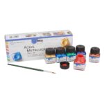 KREUL Acryl Metallicfarbe mit 6 Gläsern und einem Pinsel im Basis-Set. Die Metallicfarbe sorgt für glamouröse Effekte. Die Metallicfarbe ist eine metallisch-glamouröse Acrylfarbe. Sie ist cremig-deckend, schnelltrocknend und lichtecht. Die Farbe von KREUL ist auf Wasserbasis und kann untereinander gemischt werden. Sie können mit der Metallicfarbe wunderbar Materialien wie Holz, Papier, Karton, Styropor, Stein, durchgetrockneter Beton, Terrakotta, Glas, Keramik, Ton, Metall, Kunststoff, Leder, selbsthärtende Modelliermasse bemalen. Die Farbe eignet sich sehr gut zur dekorativen Gestaltung und ideal als Grundierung für Foto Transfer Potch und die Serviettentechnik. Inhalt: 6 Stück