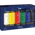 12 x 12 ml Tuben im praktischen Set. Perfekt für Einsteiger oder alle, die sich eine Grundausstattung zulegen möchten. Die hochpigmentierte Acrylfarbe auf Wasserbasis lässt sich buttrig vermalen und trocknet schnell und glänzend auf. Nach dem Trocknen ist die Farbe wasserfest und bildet einen elastischen Film. Die Acrylfarbe eignet sich für viele Untergründe wie Leinwand, Karton, Papier, Stein, Metall, Leder und vile Kunststoffe. Sie können die Farben untereinander mischen und deckend oder lasierend auftragen. Inhalt: 12 Stück