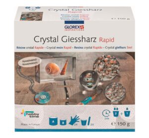 Das tolle Crystal-Gießharz lässt sich super verarbeiten und hat eine glasklare Optik. Mit ihr können Sie wunderschöne Schmuckstücke, Lasuren und Einschlussarbeiten fertigen. Das Epoxy-Gießharz ist eine einfache Mischung auf 2-Komponenten Basis. Silikonformen sind ohne Trennmittel leicht entformbar. Das Gießharz wird im Verhältnis 2:1 (2 Teile Harz, 1 Teil Härter) angemischt und härtet, abhängig von der Schichtstärke, in ca. 24-36 Stunden aus. Auch können tolle Dekorationsgegenstände wie zum Beispiel Muscheln, Sand, Perlen, Glitter, kleine Steine und viele weitere schöne Utensilien in das Harz eingelassen werden. Somit erhalten Sie eine wundervolle interessante Struktur in Ihren Werken. Mit Abtönfarben kann die transparente Gießmasse auch eingefärbt werden, um eine tolle Farbgebung zu bekommen. Gießharz eignet sich auch sehr gut für Pouring. Hiermit lassen sich tolle Bilder mit fantastischen Farbverläufen und Strukturen gestalten. Durch einen Embossing-Trockner können Sie genau bestimmen, wie der Verlauf aussehen soll. Oder verwenden Sie das Gießharz zum Beispiel zum Auffüllen von Rissen in Holztischen und Lasieren von Tablett-Böden. Für das richtige Mischverhältnis beachten Sie die Angaben des Herstellers. Anzahl Teile: 8