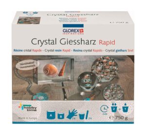 Das tolle Crystal-Gießharz lässt sich super verarbeiten und hat eine glasklare Optik. Mit ihr können Sie wunderschöne Schmuckstücke, Lasuren und Einschlussarbeiten fertigen. Das Epoxy-Gießharz ist eine einfache Mischung auf 2-Komponenten Basis. Silikonformen sind ohne Trennmittel leicht entformbar. Das Gießharz wird im Verhältnis 2:1 (2 Teile Harz, 1 Teil Härter) angemischt und härtet, abhängig von der Schichtstärke, in ca. 24-36 Stunden aus. Auch können tolle Dekorationsgegenstände wie zum Beispiel Muscheln, Sand, Perlen, Glitter, kleine Steine und viele weitere schöne Utensilien in das Harz eingelassen werden. Somit erhalten Sie eine wundervolle interessante Struktur in Ihren Werken. Mit Abtönfarben kann die transparente Gießmasse auch eingefärbt werden, um eine tolle Farbgebung zu bekommen. Gießharz eignet sich auch sehr gut für Pouring. Hiermit lassen sich tolle Bilder mit fantastischen Farbverläufen und Strukturen gestalten. Durch einen Embossing-Trockner können Sie genau bestimmen, wie der Verlauf aussehen soll. Oder verwenden Sie das Gießharz zum Beispiel zum Auffüllen von Rissen in Holztischen und Lasieren von Tablett-Böden. Für das richtige Mischverhältnis beachten Sie die Angaben des Herstellers. Anzahl Teile: 8