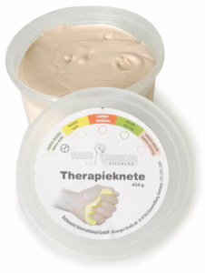 Die Handknete gibt es in fünf verschiedenen Stärken, die abhängig vom Trainingsstand bzw. Therapieverlauf ausgewählt werden.Bei rheumatischen Beschwerden unterstützt die Knete den Erhalt der Finger- und Handbeweglichkeit. Durch das Kneten werden Handmuskeln gekräftigt, die Dehnung verbessert und die Finger geübt.Als reiner Handtrainer wird die Handknete auch für den Kraftsport eingesetzt. Die Handknete bildet eine interessante Alternative zum Pressball bzw. Gelball und ist ideal zur Rehabilitation und zum Erhalt der Beweglichkeit von Fingern und Händen. Material:Angenehm im Griff, schmiert nicht und färbt nicht und wird nicht hart.Die Knete ist frei von Hyperallergenen, Latex und Fette, damit Allergiker geeignet.Die Handknete enthält keine tierischen Produkte, sie ist vom Hersteller als vegan bestätigt.Inhalt je Dose 453gStärke – Farbe:Extraleicht – elfenbeinLeicht – gelbMittel – rotStar…