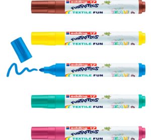 Die Stifte „“edding 17, funtastic textile fun““ bestehen aus 5 großartigen Farben für farbenfrohen Malspaß. Enthalten sind die Farben: Gelb, Braun, Hellblau, Karminrot und Blassgrün. Sie halten auf fast allen hellen Textilien wie Baumwolle, Seide oder Leinen. Die Rundspitze hat eine Strichbreite von ca. 2-3 mm und enthält geruchsneutrale Pigmenttinte auf Wasserbasis. T-Shirts, Taschen oder Hemden können mit diesen Stiften nach Belieben verziert werden. Hier können sich besonders Kinder kreativ austoben und nach Lust und Laune auch ihre eigene Bettwäsche designen. Vor dem Bemalen der Textilien sollte eine Pappe unter den Stoff, bzw. zwischen die einzelnen Lagen gelegt werden, damit die Farbe nicht durchschlägt. Durch einmaliges Bügeln ohne Dampf wird die Farbe dauerhaft haltbar gemacht und ist waschfest bis zu 60 °C. Strichstärke: 2 – 3 mm Inhalt: 5 Stück