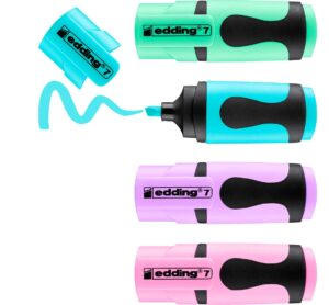 Das edding 7 „“Mini-Textmarker““ Pastell Set enthält 4 dezente Farben. Die Keilspitze ermöglicht eine Strichbreite von 1 – 3 mm. Somit können feine Unterstreichungen vorgenommen werden, aber auch breite Markierungen. Im Set sind die Farben Pastellrosa, Pastellviolett, Pastellblau und Pastellgrün enthalten. Die Tinte auf Wasserbasis drückt nicht durch das Papier. Die ergonomische, rutschfeste Griffzone sorgt für einen guten Halt der Finger während der Nutzung. Die Mini-Textmarker finden in einer kleinen Tasche oder Schublade ihren Platz und sind aufgrund ihrer Größe auch perfekt für unterwegs geeignet. Außerdem befinden sie sich in einem wiederverwendbaren Etui. Strichstärke: 1 – 3 mm Inhalt: 4 Stück