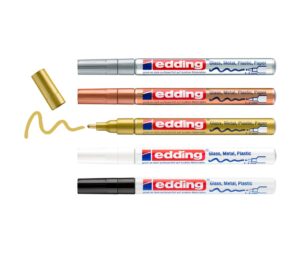 Ein edding 751 Glanzlack-Marker Metallic Set mit 5 Stiften in den Farben Gold, Silber, Weiß, Schwarz und Kupfer. Die Strichbreite der Stifte beträgt 1-2 mm. Auf den Stiften ist eine Aktivierungsanleitung. Ein Produkt mit einer hohen Qualität. Das Set erhalten Sie in einer attraktiven Box zum Aufbewahren der Glanzlack-Marker. Eine wunderbare Geschenkidee. In diesem Set finden Sie Stifte mit einer stark deckenden, permanenten und wischbeständigen Farbe. Gestalten Sie glatte Flächen wie zum Beispiel Metall, Glas, Papier oder Kunststoff. Die Farben sind auch auf dunklen und transparenten Materialien anwendbar. Die Pigmenttinte ist extrem licht- und witterungsbeständig, geruchsarm (ohne Zusatz von Toluol/Xylol), trocknet schnell und ist abriebbeständig. Tolle Stifte für Ihre neuen Projekte in einer wunderbaren Farbkombination. Strichstärke: 1 – 2 mm Inhalt: 5 Stück Material: Aluminium, Kunststoff