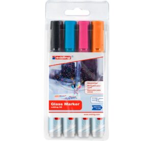 Mit den edding 95 Glass Marker-Sets können Sie immer wieder neue Beschriftungen oder Gestaltungen auf Glas, Glastafeln oder Whiteboars vornehmen. Die brillante und deckende Pigmenttinte der edding 95 ist auf Wasserbasis hergestellt und kann mit einem trockenen Tuch ganz leicht von Glas und glasähnlichen Oberflächen abgewischt werden. So können die Oberflächen immer wieder neu individuell genutzt werden. Die Marker sind gebrauchsfertig und brauchen nicht angepumpt werden. Der Marker liegt sehr gut in der Hand und dank der Rundspitze mit einer Strichstärke von 1,5-3 mm können sowohl feine Beschriftungen gemacht, aber auch Handletterings mit fetten Lettern gemalt werden. Ideal für Hobby oder Beruf. Strichstärke: 1.5 – 3 mm Lösungsmittelfrei Inhalt: 4 Stück