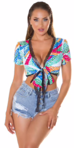 Fantasy Printed Kurzarm Crop Top mit Spitze zum Binden