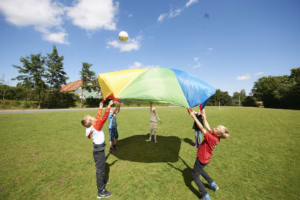 Mit dem Schwungtuch (1.75 m ) wird der ganze Körper trainiert, für Jung und Alt! Ein wunderbares Gerät für die Entwicklung der elementaren Motorik sowie des Wahrnehmumgs- und Reaktionsvermögens. Das Tuch kann gemeinschaftlich hin und her sowie auf und ab geschwungen werden und fördert somit den Teamgeist. Besonders aufregend und herausfordernd wird das Spiel, wenn zusätzlich mit einem Ball gespielt wird, welcher trotz des Auf- und Abschwingens auf dem Tuch behalten werden soll. Darüber hinaus sind deiner Fantasie keine Grenzen gesetzt und es ergeben sich noch weitere unzählige Aktivitätsmöglichkeiten. Durch die Vielfalt an Spielmöglichkeiten ist das Gerät nicht nur für Kinder, sondern auch für Erwachsene geeignet. Das Schwungtuch besteht aus buntem, leichten, weichen sowie feuerhemmenden Polyester und besitzt 8 robuste, sichere Handgriffe. Um über die Anzahl an vorhandenen Handgriffen hi…