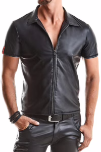 Herren T-Shirt RMRemo001 in mattem Wetlook Slim-Fit Polo Shirt mit Stehkragen und Reißverschluss aus schwarzem Stretchmaterial von Regnes Fetish Planet September 7, 2025 Sexy Shirt Preis: 79.9 EUR Zur Produktbeschreibung
