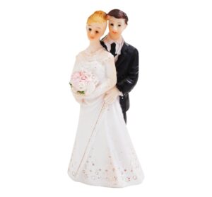 Hochzeitspaar/Brautpaar für Geschenkideen zur Hochzeit oder die Hochzeitstorte. Das dekorative Brautpaar-Figur ist ca. 6,5 cm hoch und kann sehr schön auf der Hochzeitstorte platziert werden. Die blonde Braut mit Hochsteckfrisur trägt eine traditionelles weißes Brautkleid und einen Brautstrauß. Der dunkelhaarige Brätutigam umarmt die Braut von hinten. Ein harmonisches Bild von Braut und Bräutigam. Höhe: 6.5 cm Material: Polyresin