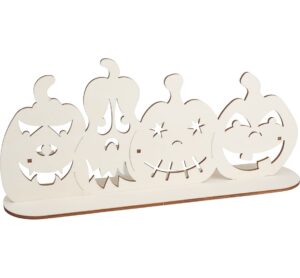 Diese Stehfigur Holz-Kürbisse hat eine Größe von ca. 52 cm x 12,5 x 23,5 cm. Das Material ist hochwertiges Sperrholz mit einer Stärke von ca. 0,5 cm. Auf der Rückseite der Holz-Kürbisse ist eine Leiste angebracht, an der eine Lichterkette mit 10 Lichtern befestigt werden kann. Die Lichterkette ist nicht im Lieferumfang enthalten. Eine wundervolle Dekoration für die Halloween-Zeit! Gestalten Sie die Holz-Kürbisse ganz nach eigenen Wünschen mit Bastelfarbe, Chalky Color, Strohseide, Decoupage Papier oder mit der Serviettentechnik. Mit Schleifenbändern und Streuteilen wird die Dekoration individuell. So wird die Figur zu einem schaurig-schönen Hingucker für die Fensterbank oder Kommode. Tipp: Fixieren Sie die Lämpchen auf der Rückseite der Figur mit etwas Heißkleber, damit diese besser halten. Anzahl Teile: 3 Länge: 52 cm Breite: 12.5 cm Höhe: 23.5 cm Material: Sperrholz Stärke: 0.5 cm