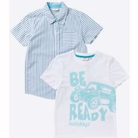 Dieses Kinder Jungen Set von Kids überzeugt mit einem stilvollen Hemd und einem T-Shirt, die beide aus reiner Baumwolle gefertigt sind. Das Hemd präsentiert dezente Streifen, während das T-Shirt mit einem modischen Druck begeistert. Zertifiziert nach OEKO-TEX®. Stilvolles Kinder Jungen Set Hemd mit Streifenmuster T-Shirt mit modischem Druck Reine Baumwolle für angenehmen Komfort OEKO-TEX® Standard