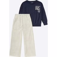 Dieses Kinder-Mädchen-Set von Kids überzeugt durch ein Oversized-Shirt mit auffälligem Backprint und Frontprint sowie einer gestreiften Hose mit weitem Bein. Das Set besticht durch bequeme Passformen, elastische Bündchen und Taschen, die komfortablen Tragekomfort bieten. Perfekt geeignet für kleine Trendsetterinnen, die Wert auf lässiges Design und Bewegungsfreiheit legen. Modischer Backprint und Frontprint Oversized Shirt mit überschnittener Schulter Gestreifte Hose mit weitem Bein Bequemer elastischer Bund mit Taschen Rippbündchen an Halsausschnitt und Ärmelsaum OEKO-TEX® Standard 100