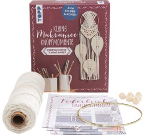 Ideal für zwischendurch! Das Set Kleine Knüpfmomente: Makramee-Knüpf-Set „“Federleichter Traumfänger““ ermöglicht das Umsetzen eines kleinen DIY-Projektes. Es ist das komplette Material sowie eine detaillierte Anleitung mit Schritt-für-Schritt-Fotos enthalten. Von der Autorin Carina Walther. Der schicke Traumfänger sieht kompliziert und eindrucksvoll aus, lässt sich aber auch von Einsteigern leicht nachbasteln. Mit einem Ø von ca. 10 cm ist er eine niedliche Dekoration für die Wand oder das Fenster. Jetzt heißt es nur noch: Ran an das Garn und losknüpfen! Anzahl Teile: 8 Material: Holz, Metall, Baumwolle