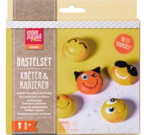 Witziges Kneten & Radieren Bastelset „“Be Happy““ zur Herstellung von 5 lustigen Radiergummis. In dem Set ist alles enthalten, was benötigt wird. Sie erhalten 4 Modelliermassen à 20 g, 4 Modelliermassen à 5 g und 2 Modellierstäbe. Dieses Modellierset bringt gleich doppelte Freude. Es macht nicht nur riesigen Spaß diese Gesichter zu modellieren, sondern sie können auch als Radierer benutzt werden. Die Modelliermasse lässt sich kinderleicht verarbeiten und mit der ausführlichen Step by Step Anleitung ist das Nachformen der lustigen Gesichter ganz einfach. Die Modellierstäbe helfen dabei, den Emojis den passenden Gesichtsausdruck zu geben oder mit Highlights wie Sonnenbrille oder Herzchenaugen zu verzieren. Die Gesichter können auch auf einen Bunt- oder Bleistift gesetzt werden. Hierfür vor dem Aushärten ein Loch in die Unterseite drücken. Das Aushärten erfolgt im Backofen bei 125 °C für ca. 30 Minuten. Ein kreatives Mitbringsel ober Geschenkidee zum Geburtstag, Ostern, Weihnachten, Konfirmation oder Kommunion. Gewicht: 20 g Inhalt: 5 Stück