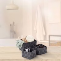 Die ansprechende Flecht-Optik macht dieses Körbe-Set zu einem Gewinn für jeden Haushalt. Die einzelnen Körbe sind nicht nur dekorativ, sondern bieten Ihnen auch viele nützliche Einsatzzwecke. Damit der Inhalt sicher verstaut ist, sind die Körbe mit Metallstangen verstärkt, um zusätzlich Stabilität und Langlebigkeit zu gewährleisten. Mit Metallstangen für zusätzliche Stabilität Vielseitig einsetzbar Maße: 1-mal ca. 20x15x13,5cm und 2-mal ca. 13x13x9cm Hinweis: Dekoration nicht im Lieferumfang enthalten.