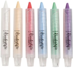 Wunderschöne Kreidestifte farbig sortiert zum Gestalten von glatten Oberflächen. Diese tollen Kreidestifte sind perfekt zum Verzieren und Gestalten von Tafelfolie, Tafeln, Porzellan, Fenstern und Papier. Die Kreidestifte sind wasserlöslich und eigenen sich super für Fensterbilder und Lettering. Werden Sie kreativ und gestalten mit den Kreidestiften je nach Jahreszeit Ihre Fenster mit wunderschönen Fensterbilder, tollen Letteringsprüchen, eine Tafel im Eingangsbereich mit einem tollen Willkommensgruß oder auch Trinkgläser oder Tassen auf dem schön gedeckten Tisch als Platzkarten. Mit diesen Kreidestiften können Sie Ihrer Kreativität freien Lauf lassen und die tollsten Dinge gestalten. Inhalt: 6 Stück Material: Kalk