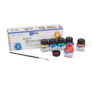 KREUL Acryl Metallicfarbe mit 6 Gläsern und einem Pinsel im Basis-Set. Die Metallicfarbe sorgt für glamouröse Effekte. Die Metallicfarbe ist eine metallisch-glamouröse Acrylfarbe. Sie ist cremig-deckend, schnelltrocknend und lichtecht. Die Farbe von KREUL ist auf Wasserbasis und kann untereinander gemischt werden. Sie können mit der Metallicfarbe wunderbar Materialien wie Holz, Papier, Karton, Styropor, Stein, durchgetrockneter Beton, Terrakotta, Glas, Keramik, Ton, Metall, Kunststoff, Leder, selbsthärtende Modelliermasse bemalen. Die Farbe eignet sich sehr gut zur dekorativen Gestaltung und ideal als Grundierung für Foto Transfer Potch und die Serviettentechnik. Inhalt: 6 Stück