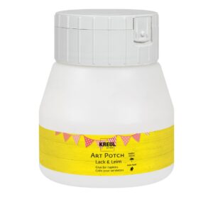 Mit dem KREUL Art Potch Lack & Leim „“Matt““ kannst du ganz unkompliziert Serviettentechnik auf verschiedensten Untergründen umsetzen. Der seidenmatte Kleber und Lack auf Wasserbasis trocknet transparent auf und ist perfekt für einen schlichten Look. Das Besondere an diesem Produkt ist, dass es sowohl als Kleber als auch als Lack verwendet werden kann. So brauchst du nur ein Produkt, um Serviettenmotive aufzukleben und anschließend zu lackieren. Der Spezialkleber ist außerdem wasserfest und feuchte Klebstoff-Flecken können einfach mit warmem Wasser ausgewaschen werden. Auch für Kinder ab 6 Jahren ist der KREUL Art Potch Lack & Leim geeignet. Die Gebinde des KREUL Art Potch Lack & Leim sind aus recyceltem Plastik hergestellt und somit nicht nur praktisch, sondern auch nachhaltig. Mit dem kleinen, praktischen Ausgießer und der großen Öffnung für breite Pinsel ist das Auftragen des Potchs besonders einfach. Der Art Potch eignet sich zur Gestaltung von verschiedensten Materialien wie Holz, Karton, Leinwand, Kork, Keramik, Terrakotta, Stein, Beton, Glas, Metall, Kunststoff und sogar Styropor. Auch auf Acrylglas, Filz, Fliesen, Fotopapier, Gips, Leder, MDF, Modelliermasse, Papier, Papiermaché, Textilien/Stoffe, Ton, Styropor und Pappe/Karton kann der Lack & Leim aufgetragen werden. So geht’s: Trage den Potch dünn auf den gewünschten Gegenstand auf. Lege die oberste, bedruckte Serviettenlage auf und streiche mit dem Potch darüber. Durch die seidenmatte Textur des Potchs wird das Serviettenmotiv perfekt auf dem Untergrund fixiert. Mit dem KREUL Art Potch Lack & Leim „“Matt““ kannst du also ganz einfach und schnell deine Lieblingsdeko selbst gestalten. Probiere es doch mal aus und schau, wie schnell du zu einem tollen Ergebnis gelangst. Füllmenge: 250 ml Lösungsmittelfrei