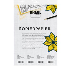 Mit dem KREUL Durchschreibepapier können Sie Motive übertragen. Dank des gelben Papiers ist es auch möglich auf dunkle Untergründe zu übertragen. Nutzen Sie es für Fensterbilder, Motive auf Holz, Metall, Stein, Glas, Keramik, Kunststoff, Karton, Leinwand, Tapete, dunkle Stoffe. Mit dem Kopierpapier können Sie ganz einfach auch schwierige Motive übertragen und zaubern so echte Hingucker. Länge: 42 cm Breite: 30 cm Material: Papier