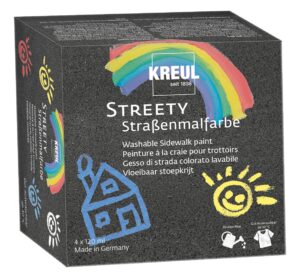 Das KREUL „“Streety Starter-Set““ Straßenmalfarbe hat einen Inhalt von 4 x 120 ml in den Farben Wolkenweiß, Gummientengelb, Ringelsockenrot und Badelatschenblau. Die Farbe ist abwaschbar und gut mit 30° C auswaschbar. Ein cooles Set Straßenmalfarben mit dem im Nu einzigartige Kunstwerke auf der Straße entstehen. Mit einem Pinsel werden die bunten Farben in farbenfrohe Muster und Gemälde verwandelt. Dabei sind der Kreativität der Kinder keine Grenzen gesetzt. Motive aus der Stadt, Menschen, Muster, Natur und Gemälde dienen als Inspiration und die kleinen Künstler zaubern immer wieder neue Meisterwerke. Mit Wasser löst sich die satte Farbe im Nu wieder ab. Was der Regen nicht schafft, erledigt der Gartenschlauch, ggf. mit einer Bürst nacharbeiten. Viel Spaß beim Gestalten mit diesen wunderbaren Farben. Füllmenge: 120 ml Inhalt: 4 Stück