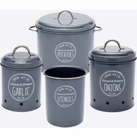 Das Küchen-Aufbewahrungsdosen-Set von home ist die perfekte Lösung für Ihre Küche. Dieses 4er-Set beinhaltet Behälter für Knoblauch, Zwiebeln und Kartoffeln sowie einen Utensilienhalter. Erhältlich in zwei modernen Farbtönen, fügt es sich nahtlos in jede Kücheneinrichtung ein. Praktisches 4er-Set für die Küche Enthält Behälter für Knoblauch, Zwiebeln, Kartoffeln Mit passendem Utensilien-Halter Größe Knoblauch-Behälter: ca. Ø 11x18cm Größe Zwiebel-Behälter: ca. Ø 13,5×20,5cm Größe Kartoffel-Behälter: ca. Ø 22,5x22cm Größe Utensilien-Halter: ca. Ø 13×15,5cm Aus robustem Metall gefertigt Erhältlich in zwei Farbvarianten Vielseitige Aufbewahrungsmöglichkeiten