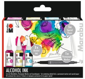 Ein Marabu Alcohol Ink-Set FLOWERS bestehend aus drei Farben Alcohol Ink, einem Permanent Marker und 5 x Spezialpapier. Beginnen Sie gleich mit Ihren neuesten Projekten und Mixed-Media Gestaltungen. Werden Sie kreativ und experimentieren Sie mit diesem hochwertigen Set. Der neue Trend Alcohol Ink Painting wird Sie begeistern. Das Set ist für Profis und Anfänger gleichermaßen geeignet. Erzielen Sie beeindruckende Ergebnisse und kreieren Sie mit diesen intensiven und hochwertigen Farben schöne Farbverläufe, überraschende Formen und abstrakte Effekte. Die Farben können auf nahezu allen glatten, nicht porösen Untergründen, wie beispielsweise Glas, Porzellan oder Fliesen aufgetragen werden. Lassen Sie sich entführen in die Welt der Farben und gestalten Sie kleine und große Kunstwerke mit dem Alcohol Ink Painting. Anzahl Teile: 9