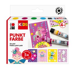 Mit dem Marabu KiDS Dot Pen Set „“Einhorn““ können Kinder und Erwachsene fantasievolle Kunstwerke mit der Dot Pens erschaffen! Das Set enthält die Farben Gelb, Magenta, Hellblau und Gelbgrün mit jeweils 25 ml, eine Anleitung sowie fünf exklusive bunte Bastelvorlagen im Postkartenformat, die mit den Dot Pens individuell bepunktet werden können. Die DIN A6 Bastelvorlagen sind farbig mit fantasievollen kindgerechten Motiven bedruckt. Je nach Farbauftragsmenge variiert die Punktgröße der selbstformenden Punktfarbe. Mit dem Marabu KiDS Dot Pen Set „“Einhorn““ kannst du auf Papier, Pappe, Karton, Holz, Stein, Glas, Keramik und Textilien/Stoffe (bis 20 % Kunstfaseranteil) kreativ werden. Die wasserbasierte Punktfarbe ist matt und deckend. Tipps zum Malen auf Textilien: Neue Textilien müssen vor dem Bemalen mindestens einmal ohne Weichspüler gewaschen werden. Appreturen und Weichspüler verhindern das Eindringen der Farbe in die Faser, eine Haftung nach der Fixierung ist somit nicht gewährleistet. Achte beim Malen darauf, einen ausreichend guten Kontakt mit dem Textil herzustellen. Lässt du die Farbe nur auf das Textil fallen, entsteht kein ausreichende Kontakt zur Faser und die Waschbeständigkeit der Farbe nach der Fixierung ist nicht gewährleistet. Die Punktfarbe kann im Schonwaschgang in einem Wäschebeutel bis zu einer Temperatur von 30 °C gewaschen werden. Nicht im Trockner trocknen oder bügeln. Mit dem Marabu KiDS Dot Pen Set „“Einhorn““ startest du in die fantastische Welt der Punktfarben, mit der du zahlreiche neue Ideen umsetzen kannst. Füllmenge: 25 ml Geeignet für Kinder Inhalt: 4 Stück