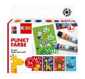 Mit dem Marabu KiDS Dot Pen Set „“Tiere““ begeben sich Kinder und Erwachsene auf die kreative Reise mit den Punktfarben. Das Set enthält 4 x 25 ml Liner in den Farben Orange, Zinnoberrot hell, Mittelblau und Saftgrün, eine Anleitung sowie fünf exklusive bunte Bastelvorlagen im Postkartenformat, die mit den Dot Pens individuell bepunktet werden können. Die DIN A6 Bastelvorlagen sind farbig mit kindgerechten Tiermotiven bedruckt. Je nach Farbauftragsmenge variiert die Punktgröße der selbstformenden Punktfarbe – so kann jeder Punkt individuell gesetzt werden. Du kannst auch Punkte auf Punkte setzten – so kannst du vielfältige Kombinationen von Punkten entstehen lassen. Mit dem Marabu KiDS Dot Pen Set „“Tiere““ kannst du auf vielen Materialien wie Papier, Pappe, Karton, Holz, Stein, Glas, Keramik und Textilien/Stoffe (bis 20 % Kunstfaseranteil) kreativ werden. Die wasserbasierte Punktfarbe ist matt und deckend. Tipps zum Malen auf Textilien: Neue Textilien müssen vor dem Bemalen mindestens einmal ohne Weichspüler gewaschen werden. Appreturen und Weichspüler verhindern das Eindringen der Farbe in die Faser, eine Haftung nach der Fixierung ist somit nicht gewährleistet. Achte beim Malen darauf, einen ausreichend guten Kontakt mit dem Textil herzustellen. Lässt du die Farbe nur auf das Textil fallen, entsteht kein ausreichende Kontakt zur Faser und die Waschbeständigkeit der Farbe nach der Fixierung ist nicht gewährleistet. Die Punktfarbe kann im Schonwaschgang in einem Wäschebeutel bis zu einer Temperatur von 30 °C gewaschen werden. Nicht im Trockner trocknen oder bügeln. Setzte jetzt mit dem Marabu KiDS Dot Pen Set „“Tiere““ deine zahlreichen Malideen um und Punkte was das Zeug hält. Füllmenge: 25 ml Geeignet für Kinder Inhalt: 4 Stück