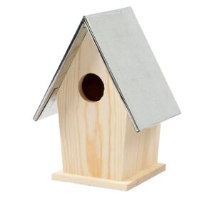 Ein toller Meisenkasten / Vogelhaus mit einem abnehmbaren Dach aus Zink. Dadurch ist der Meisenkasten leicht zu reinigen. Die Größe beträgt ca. 13,5 x 11 x 19 cm, mit einer Lochgröße von ca. 3,2 cm. Auf der Rückseite befindet sich eine Bohrung zum Aufhängen des Nistkastens. Verwenden Sie Chalky Color, Holzlasur, Bastelfarben, Strohseide, die Servietten-Technik oder die Decoupage-Technik, um dem Meisenkasten ein einzigartiges Aussehen zu verleihen. Hierbei können Sie der Kreativität freien Lauf lassen und individuell gestalten. Durch einen letzten Anstrich mit Servietten-Lack wird der Meisenkasten versiegelt und Sie haben lange Freude an der Dekoration. Eine hübsche Zierde für den Garten, als Home-Deko oder als Geschenkidee für Freunde und Familie. Anzahl Teile: 2 Länge: 13.5 cm Breite: 11 cm Höhe: 19 cm Material: Holz, Metall
