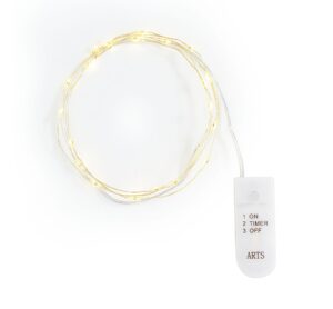 Eine vielseitig einsetzbare Micro-LED-Lichterkette für stimmungsvolle Hingucker in selbstgemachten Dekorationen. Die Lichterkette mit warmweißen LEDs besitzt einen goldfarbenen, biegsamen Draht. Insgesamt ist die Lichterkette ca. 100 cm lang. Mithilfe des Schalters am Batteriefach kann die Lichterkette ein- und ausgeschaltet oder in der Timerfunktion bedient werden. Hierbei stellt sich ein Leuchten für 6 Stunden und ein automatisches Abschalten für 18 Stunden ein. Die benötigten 2 x CR2032 Batterien sind bereits enthalten. Gebundene Kränze und floristische Gestecke, bepflanzten Schalen, Miniaturlandschaften oder einfach auf der Fensterbank drappiert setzt die Lichterkette edle Akzente. Streuteile, Deko-Schnee, Figuren, Naturmaterialien und Weihnachtskugeln ergänzen die Deko prima. Timer Anzahl Lampen: 20 Watt: 0.03 Batterien enthalten Material: Kunststoff, Draht