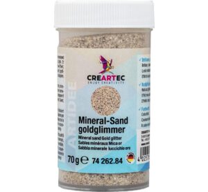 Der Mineralsand mit glänzenden Partikeln in einer Streudose setzt nicht nur Betonobjekte toll in Szene. Auch die Anwendung auf Glas und Holz funktioniert wunderbar. Schlichte Dekoelemente werden schon mit einer geringen Menge des hochwertigen Mineralsands funkelnd gestaltet. Elegante Schriftzüge, schicke Verzierungen auf Windlichtern und mehr werden in Kombination mit verschiedenen Materialien zu einem Hingucker. Die Höhe der Dose beträgt ca. 7,5 cm und der Durchmesser ca. 4 cm. Die Öffnung der praktischen Streudose ist mit 30 Löchern versehen, die einen jeweiligen Durchmesser von ca. 3 mm besitzen und somit einen einfachen Auftrag ermöglichen. Der Mineralsand besteht aus natürlichem Sand, dem Pyrit beigemengt wurde. Der Auftrag gelingt am besten, indem der Mineralsand mit Mosaikkleber gemischt wird. Auch für die Schabloniertechnik geeignet. Gewicht: 70 g Material: Sand