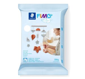 Bei der Modelliermasse „“FIMOair light““ handelt es sich um eine lufttrocknende, extra leichte Modelliermasse, die sich ohne Brennofen verarbeiten lässt. Die Knetmasse ist weiß und hat einen Inhalt von ca. 350 g. Die Modelliermasse ist sofort gebrauchsfertig und lässt sich dank der geschmeidigen Konsistenz wunderbar verarbeiten. Sie ist formstabil und besteht aus mindestens 80 % natürlichen Rohstoffen. Fertig modellierte Formen können gefeilt, geschliffen, gebohrt, bemalt oder lackiert werden. Hübsche Dekorationen für Mobiles, Wandschmuck oder auch Fensterdeko sowie schicke Modelle zum Hinstellen lassen sich mit wenigen Handgriffen formen. Hier können Hobbykünstler richtig kreativ werden. Auch für pädagogische Zwecke in Schulen, Kindergärten und weiteren Einrichtungen ideal. Lufttrocknend Gewicht: 350 g