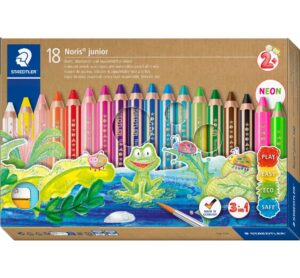 Die Noris junior Buntstifte sind der perfekte Begleiter für ungebremste Kreativität! Mit diesen vielseitigen Stiften in 3-in-1-Funktion kannst du nicht nur bunt malen, sondern auch mit Wachs malen und sogar wasservermalbare Aquarelle schaffen. Die leuchtenden Farben eignen sich für verschiedene Materialien wie Papier, Karton, Glas und sogar dunkle Oberflächen. Der softe Abstrich ermöglicht dir ein angenehmes Malerlebnis in strahlenden Farben. Besonders für kleine Kinderhände ist das kompakte Format der Stifte ideal. Die sehr dicke Mine sorgt zudem für extra Bruchsicherheit. Das Holz für die Stifte stammt aus PEFC-zertifizierten, nachhaltig bewirtschafteten Wäldern. So kannst du mit gutem Gewissen malen und basteln. Diese Buntstifte sind nicht nur ein tolles Geschenk für Kinder, sondern auch für Erwachsene, die ihre künstlerische Ader entdecken möchten. Du kannst mit den Noris junior Stiften nicht nur Malen, sondern auch schöne Karten gestalten, Ostereier bemalen oder Fensterdekorationen schaffen. Wenn du Aquarelle gestalten möchtest, kannst du die Stifte einfach mit einem nassen Pinsel über die gemalten Flächen streichen und erzeugst so wunderschöne Farbverläufe. Entdecke jetzt die Noris junior Buntstifte und lass deiner Kreativität freien Lauf! Mit diesen Stiften bist du bestens ausgerüstet und kannst deine Umgebung mit bunten Farben verschönern. Bestelle sie jetzt bei uns im Onlineshop und erlebe selbst, wie viel Spaß das Malen und Basteln mit diesen Stiften macht. Geeignet für Kinder Inhalt: 18 Stück Material: Holz