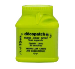 Der Paperpatch Kleber ist speziell konzipiert für Bastelarbeiten mit Décopatch-Papier. Er ist lösungsmittelfrei und auf Wasserbasis. Nach dem Trocknen bildet sich ein durchsichtiger, schimmernder, wasserdichter Film, der die Farben des Papiers zum Glänzen bringt. Gewicht: 180 g Lösungsmittelfrei