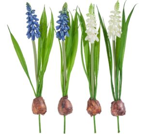 Erlebe den zauberhaften Frühling mit dem Perlhyazinthen Mix mit Zwiebel! Die vier Kunstblumen mit Blüten in Weiß und Blau bringen frischen Wind in deine Frühlingsdekorationen und verleihen ihnen einen ganz besonderen Charme. Mit einer Größe von 19,5 cm sind sie ein echter Hingucker und lassen sich vielseitig einsetzen. Dabei sind sie langlebig und können immer wieder verwendet werden. Gestalte einzigartige DIY-Projekte mit diesen Kunstblumen. Ob alleine oder in Kombination mit anderen Blumen und Steckmotiven – du kannst sie ganz nach deinem Geschmack dekorieren. Der kurze Steckdraht bietet dabei einen sicheren Halt in verschiedenen Materialien wie Steckschaum oder natürlichem Granulat. Nicht nur als Dekorationselement in Blumentöpfen, Frühlingsgestecken oder Kränzen machen die Kunstblumen eine gute Figur. Auch als Blickfang auf dem Esstisch oder im Eingangsbereich sorgen sie für Frühlingsstimmung und bereiten dir und deinen Gästen Freude. Mit einem Blüten-Ø von ca 2,5 cm und einer Breite von ca 3 cm sind die Perlhyazinthen ein echtes Highlight. Durch die Verwendung von Kunststoff und Draht lassen sie sich flexibel verarbeiten. Bestelle jetzt den Perlhyazinthen Mix mit Zwiebel und verleihe deiner Frühlingsdekoration das gewisse Etwas! Blüten-Durchmesser: 2.5 cm Inhalt: 4 Stück Länge: 19 cm Breite: 3 cm Material: Kunststoff, Draht