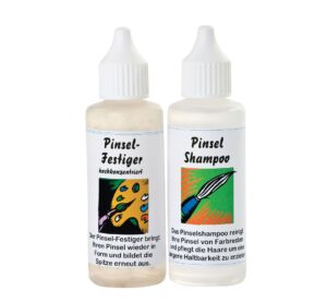 Das Set besteht aus je 50 ml Pinsel-Shampoo und hochkonzentriertem Pinselfestiger. Das Pinselshampoo reinigt Ihre hochwertigen Künstlerpinsel sorgfältig von Farbresten. Die Qualität der Pinsel bleibt so länger erhalten. Der Pinselfestiger bringt den Pinsel wieder in Form und bildet die Spitze erneut aus. Füllmenge: 50 ml Anzahl Teile: 2