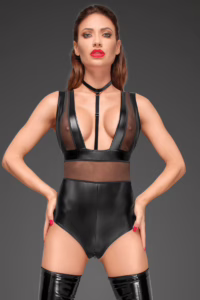 Powerwetlook Body F183, Powerwetlook Body mit transparenten Tülleinsätzen, Samtchoker und praktischem Zipper im Rücken & Schritt von Noir Handmade