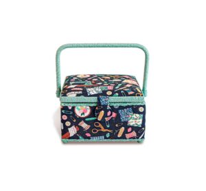 Du suchst nach einem praktischen und zugleich stilvollen Nähkorb? Dann ist der Prym Nähkorb Needle & Thread genau das Richtige für dich! Der quadratische Nähkorb ist ein echter Blickfang und bietet dir eine perfekte Aufbewahrungsmöglichkeit für deine kleineren Handarbeitsutensilien. Der Innenraum ist besonders praktisch ausgelegt, denn der herausnehmbare Kunststoffeinsatz besitzt zwei lange und zwei kurze Fächer für unterschiedliches Zubehör wie Nadeln, Knöpfe, Markierstifte oder Garnrollen. In der Deckelunterseite sind darüber hinaus zwei Stofftaschen aufgenäht, die Raum für Scheren, Maßbänder und vieles mehr bieten. Der Nähkorb verfügt über erhöhte Füße, die eine Verschmutzung des Stoffs vermeiden. Die Kanten und der Griff sind mit Korbgeflecht dekoriert – alles in allem eine attraktive Nähbox, die in keinem Nähzimmer fehlen sollte. Mit seinem dunkelblauen Baumwollstoff und dem Nähutensilien-Dekor ist er ein echter Hingucker. Der quadratische Nähkorb ist 23 cm breit, 14 cm hoch und 23 cm lang und bietet dir somit viel Platz für deine Nähutensilien. Zudem ist der Nähkorb mit einem praktischen Magnetverschluss ausgestattet. Länge: 23 cm Breite: 23 cm Höhe: 14 cm Material: Baumwolle, Synthetik, MDF-Holz