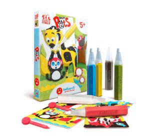 Tolles Set Sabbiarelli Sand-it for Fun Midi kit Crazy Pets mit 6 nachfüllbaren Stiften (farbiger Sand) in den Farben Rot, Gelb, Hellgrün, Hellblau, Schwarz und Weiß, 5 bedruckten und vorgeschnittenen Haftblättern, 2 Schabern und 2 kleinen Wannen aus Papier. Die vorgeklebten Zeichnungen haben eine Größe von ca. 14 x 21 cm. Ein Set mit unterschiedlichen Motiven zum Anmalen mit Sand. Inklusive Anleitung und Gebrauchsbeispielen mit QR-Code für Videotutorials. Die Sabbiarelli werden aus recyceltem Material hergestellt. Bei der Gewinnung der großen Blöcke aus weißem Marmor in den Steinbrüchen in Carrara lösen sich kleine Stücke ab, die für eine traditionelle Verarbeitung unbrauchbar sind. Diese Reste werden aufgesammelt, gemahlen, mit ökologischen Pigmenten auf Wasserbasis eingefärbt und in die Sabbiarelli-Dosierstifte gefüllt. In Kombination mit den speziellen Haftbögen, auf die die Zeichnungen gedruckt und geschnitten werden, ergeben sich glitzernde Marmorsand-Bilder. Für das Färben des Sands werden spezielle ungiftige Pigmente auf Wasserbasis verwendet. Sie überdecken den Glanzeffekt dank der kristallinen, äußerst strahlenden Natur des weißen Carrara-Marmors nicht. Und so wird es gemacht: Mit den im Set enthaltenen Schabern wird nach und nach die Folie von den vorgeklebten und vorgeschnittenen Motiven entfernt. Das Motiv in die Papier-Wanne legen und die freigelegten Motive mit farbigem Sand bestreuen. Nun mit den Fingern ein wenig verteilen und andrücken. Sandreste wieder zurücktun. Anschließend die nächste Folie abziehen und mit Sand bestreuen. So entsteht Stück für Stück ein wundervolles Bild mit Glanzeffekt. Ein kreatives Set zum Spielen für große und kleine Künstler und eine tolle Geschenkidee. Anzahl Teile: 15 Selbstklebend Länge: 18.5 cm Breite: 3 cm Höhe: 24.5 cm Material: Kunststoff, Sand, Papier