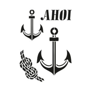 Schiff AHOI! Eine tolle Schablone „Ahoi“ im Format DIN A4. Der flexible Kunststoff der Universalschablone ermöglicht auch das Schablonieren auf gebogenen und unebenen Untergründen. Die maritimen Motive haben eine Größe von 10,9 x 7,9 cm, 10,2 x 3,7 cm, 17,0 x 12,3 cm und 13,0 x 4,3 cm. Um die Motive auch einzeln verwenden zu können, empfehlen wir, die restlichen Motive mit Kreppband abzukleben. So können saubere und hervorragende Ergebnisse erzielt werden. Für das Fixieren der Malschablone auf unebenen und senkrechten Untergründen empfehlen wir, ein Haftspray zu verwenden. Durch den Haftgrund wird ein Verrutschen der Schablone auf dem Malgrund ermieden. Schablonieren ist vielfältig, einfach und auf fast allen Materialien möglich. Die Universalschablonen sind für alle Schablonier-Techniken wie Sprayen, Stupfen, Ausmalen, Kleben und Bestreuen oder Modellieren geeignet. Egal ob auf Textilien, Wänden, Glas, Holz, Terrakotta oder Papier – mit dieser Schablone und der passenden Farbe werden schicke Dekorationen im Maritimen-Flair gestaltet. Gestalten Sie zum Beispiel Keilrahmen, Holzschilder oder auch Kissenhüllen mit dieser Schablone mit tollen maritimen Motiven. Extra-Tipp: Damit die Schablone mehrfach und lange verwenden werden kann, sollte diese unverzüglich mit Wasser und Seife gereinigt werden. Anzahl Motive: 4 DIN Format A4 Material: Polypropylen (PP)